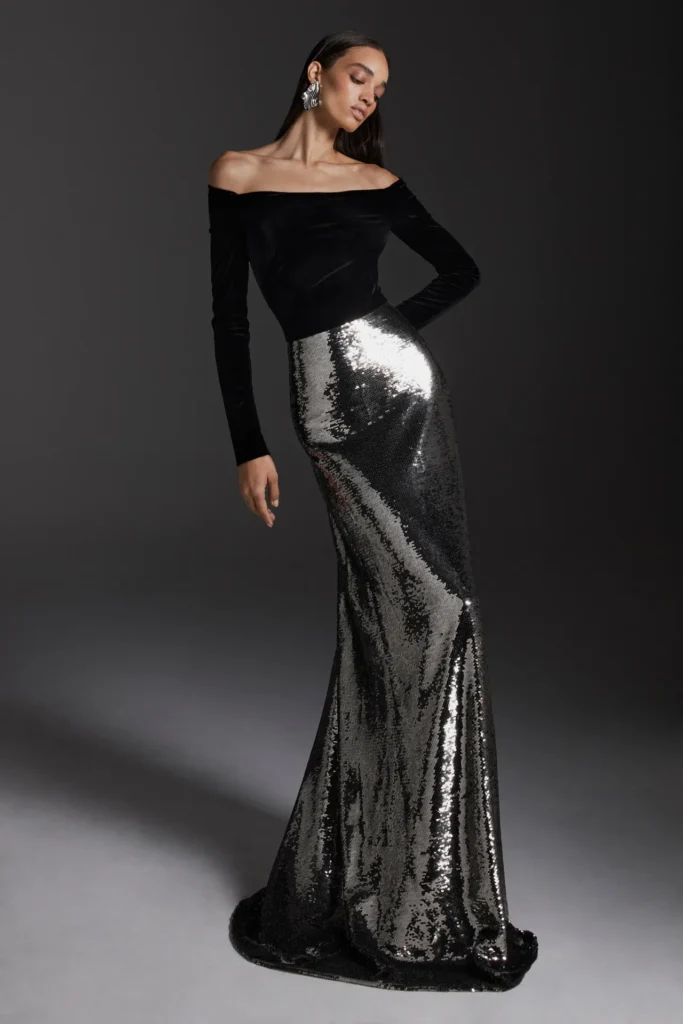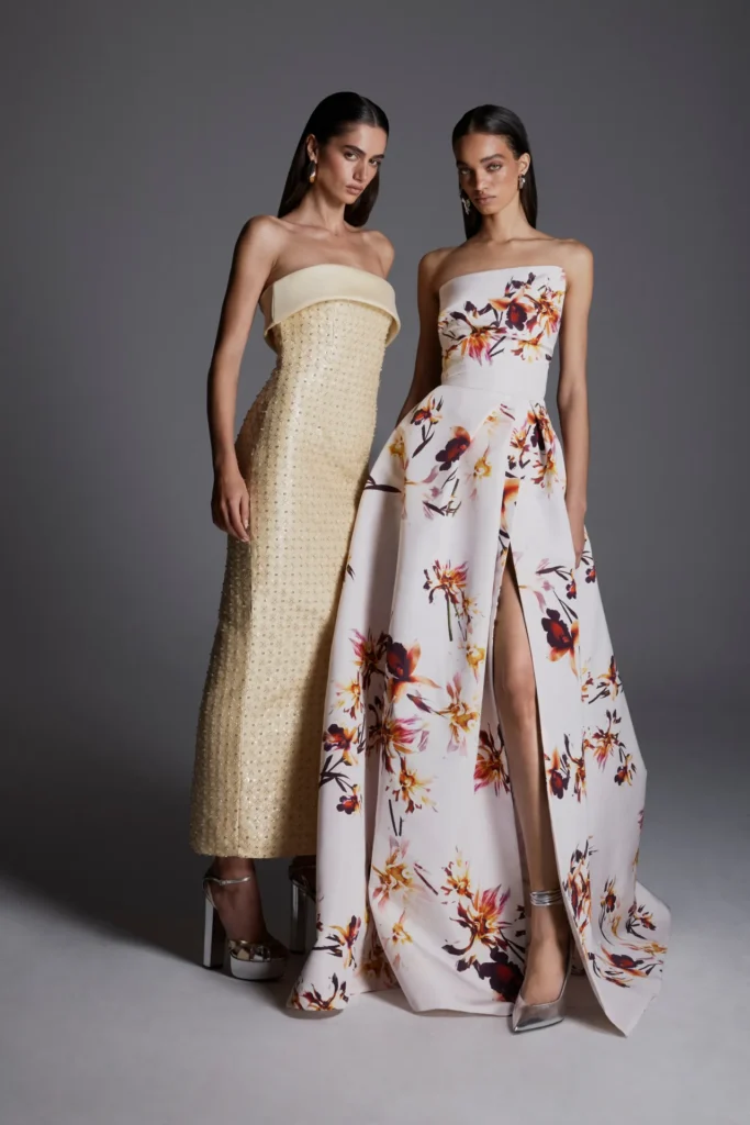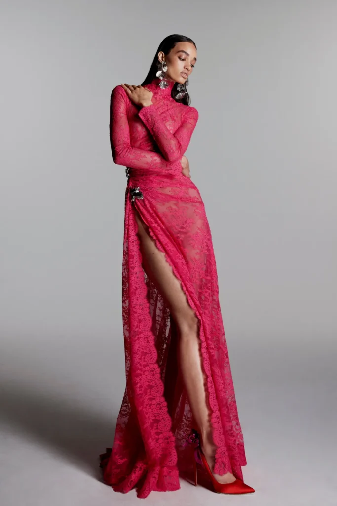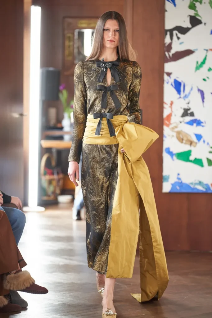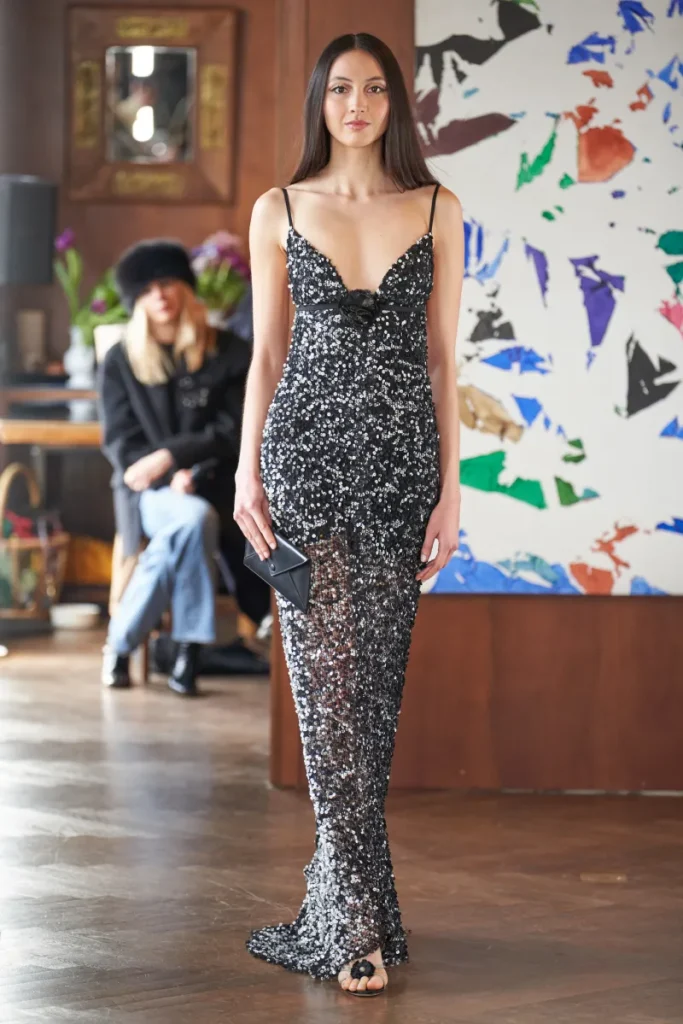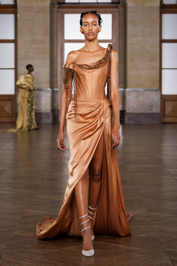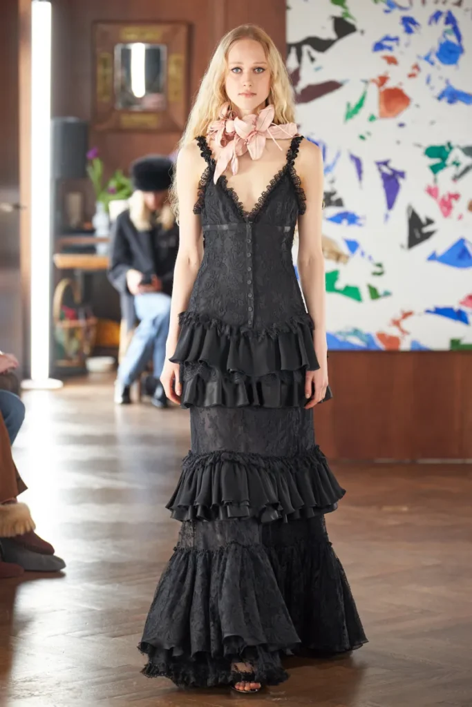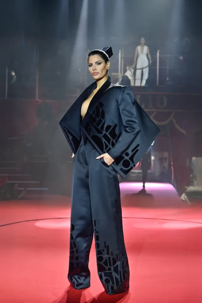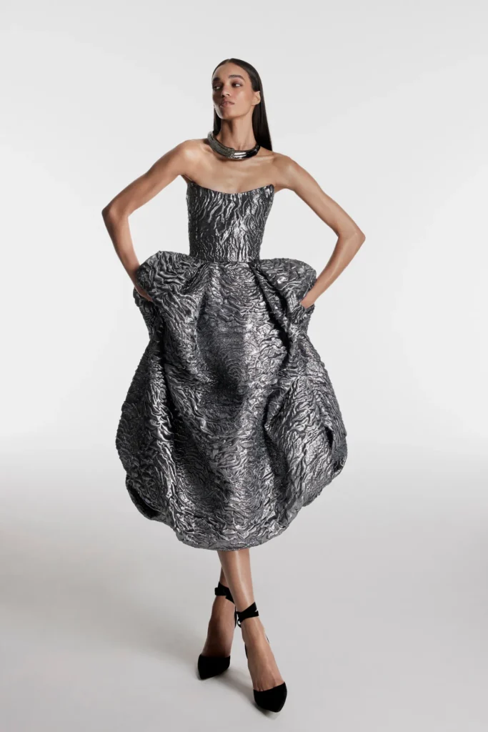 From there, the collection traced a cosmic arc. The birth of the universe appeared in all-black looks streaked with star-dust embroidery, evoking the Big Bang. The emergence of life followed: a white column gown swirling like a floral vortex; another textured with reptilian scales. Spiritual awakening arrived in the form of a replicated Indian temple sculpture, perched atop a deceptively simple draped skirt.