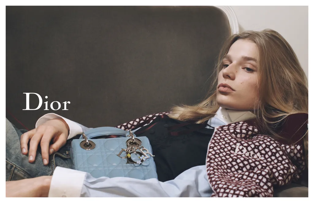 Murad studied archival images of women strolling through winter gardens, translating their romantic atmosphere into delicate, painterly prints. These motifs offered a gentler counterpoint to the bold florals often associated with the house, setting a more restrained yet refined tone.