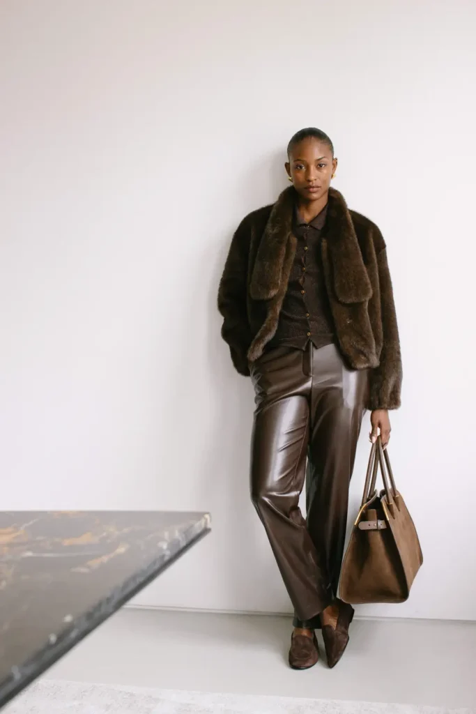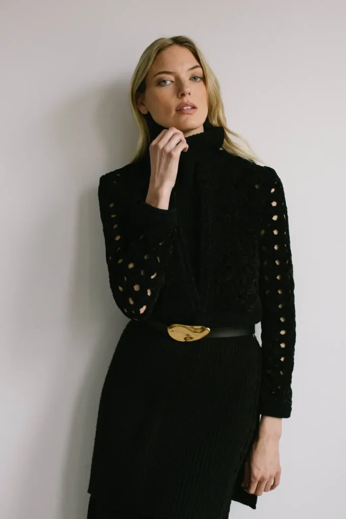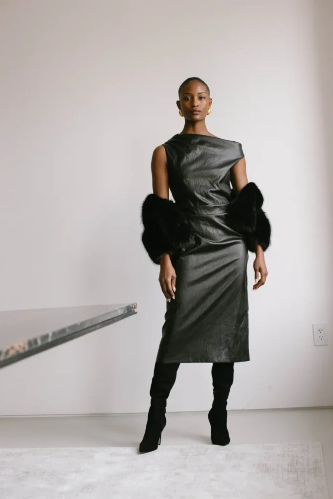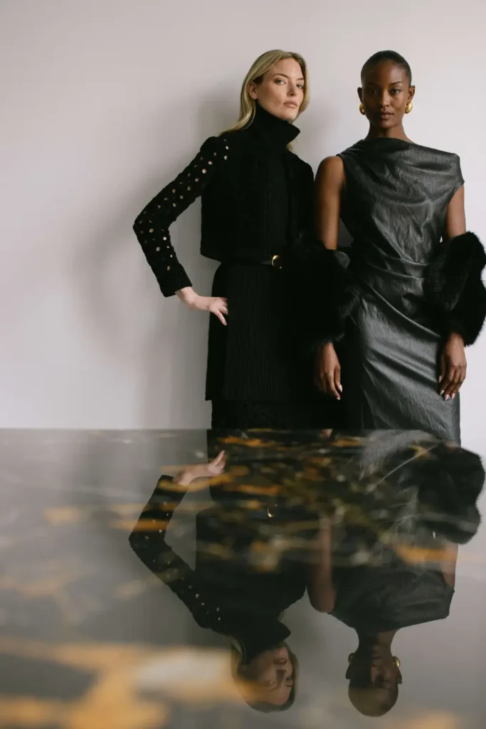 Outerwear set the tone. A sweeping coat and cropped peplum jacket appeared to be crafted from feathers, yet revealed themselves as meticulously trimmed faux fur. Elsewhere, organza boning wrapped in tulle sculpted tuxedo jackets into wing-like forms, giving architectural rigidity to fabrics typically prized for fluidity. In contrast, a severe column gown rippled with black and silver sequins, its surface engineered to move like liquid metal. A mesh bodysuit spliced at the hip created the illusion of separation, allowing the silhouette to shift with every step.
