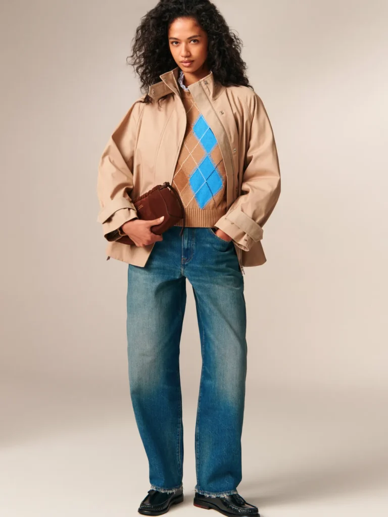 In menswear, Ivy League staples arrive with edge. Waffle-knit rugbys replace standard jerseys; varsity jackets bloom in saturated autumn hues; field jackets appear in quilted nylon; parkas are rendered in Gore-Tex; tailored pieces gain functional, utility-driven pockets. Even the classic duffle coat feels newly pragmatic.