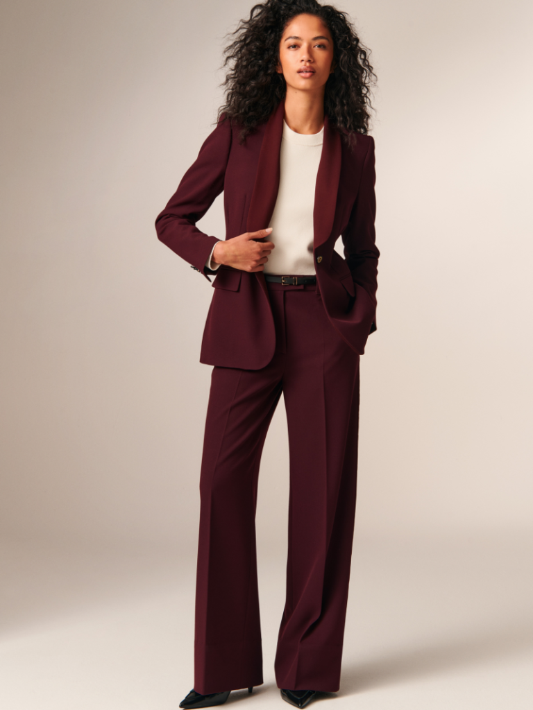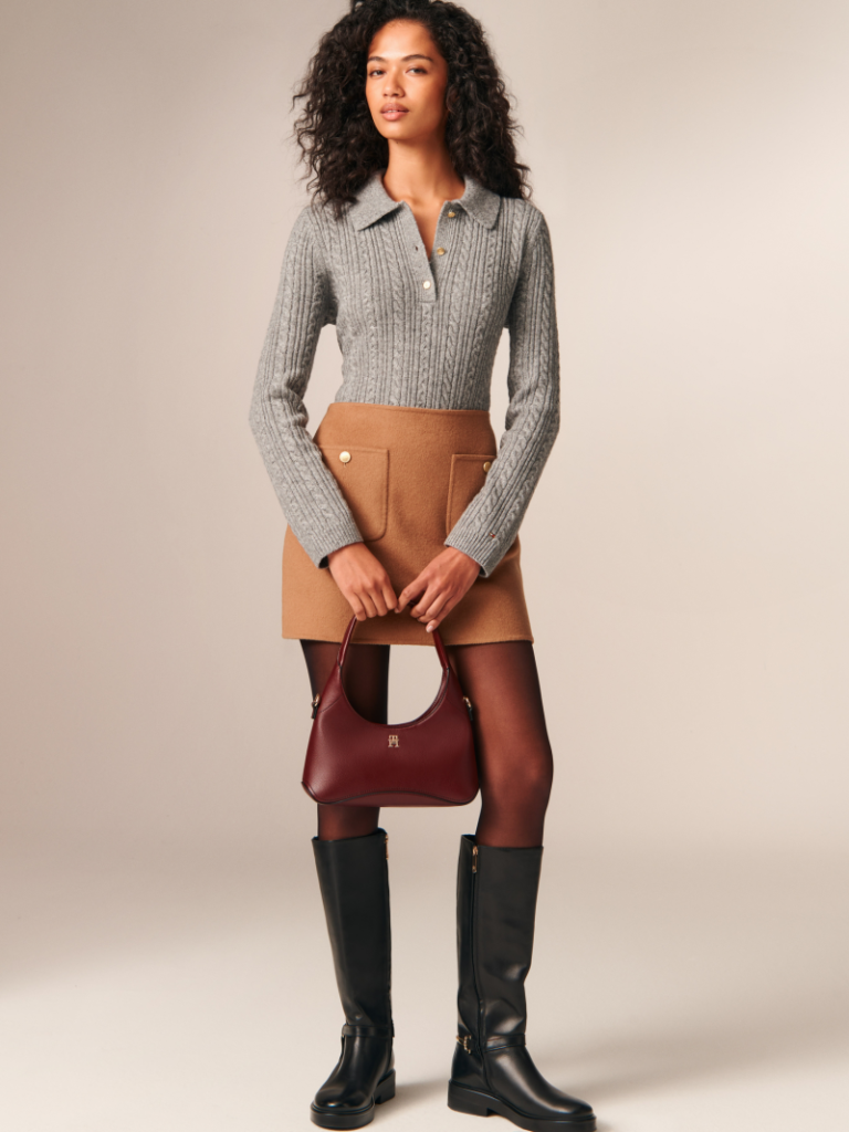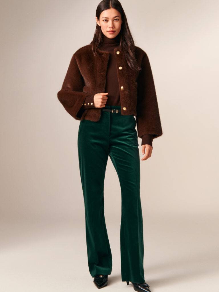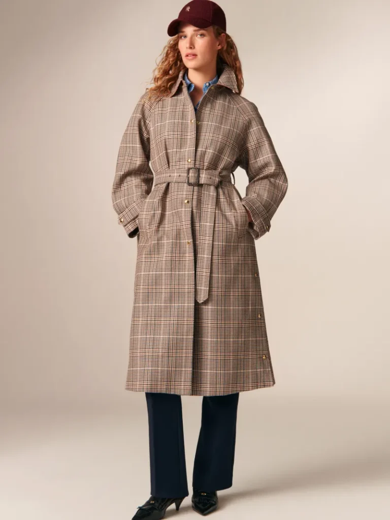 Womenswear sharpens the conversation through proportion. Cropped trenches, gold-button blazers, and pleated tartan skirts anchor the lineup. Cable knits and shirting inject color; suiting emerges in tweed and velvet; faux fur and shearling introduce winter texture without excess. A detachable faux-fur collar on a traditional wool coat underscores the season’s emphasis on adaptable polish.