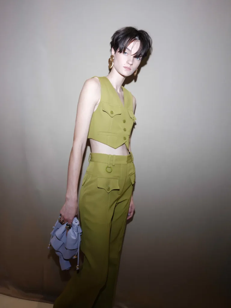 Menswear influences peeked in through tonal dressing — a nod to vintage Lavender Bay photographs — with utility jackets, sculptural flared pants, and color-blocked jumpsuits accented with retro metal rings.