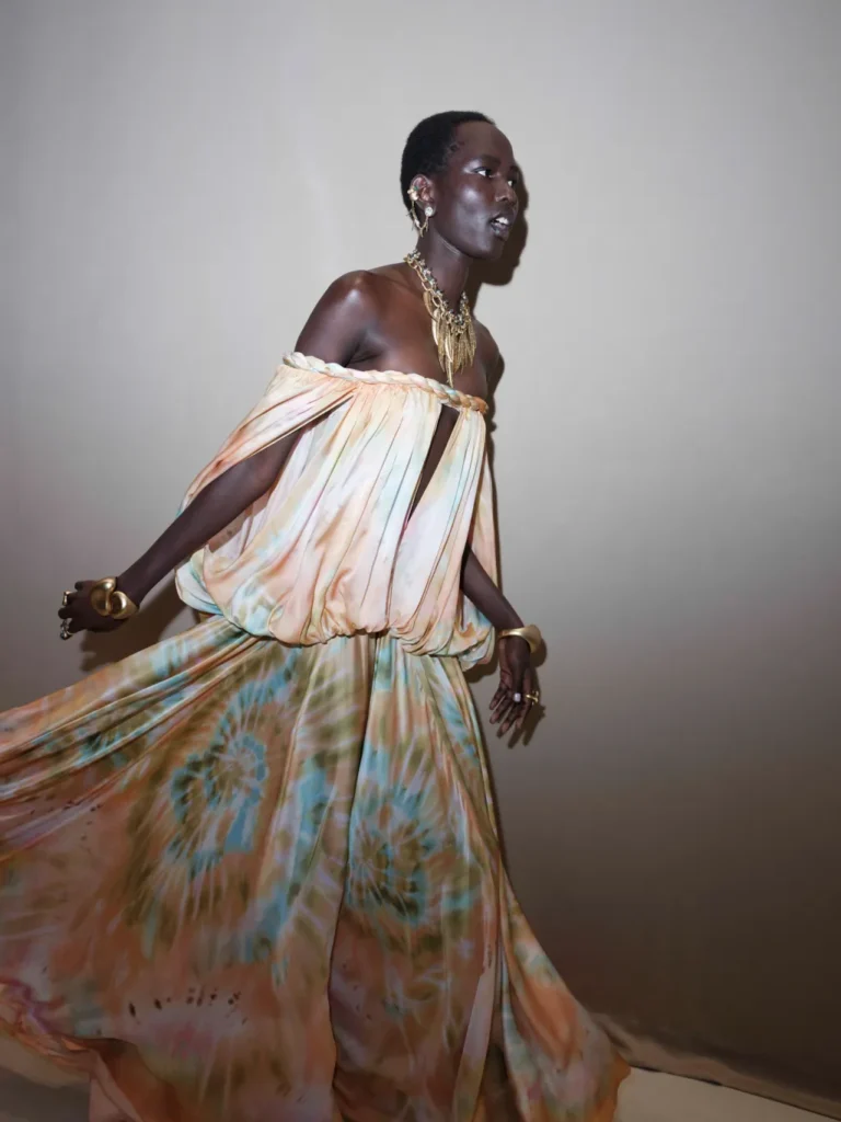 That hedonistic energy flowed through the collection’s warped floral prints and rainbow tie-dyes, drifting across parachute dresses and gauzy layered tops that seemed to move with the air itself. “I always love movement,” said the designer, “but this time, I wanted the prints to move too.”